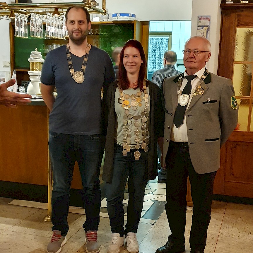 Nach der Preisverleihung, begann das traditionelle Königsschießen auf den Adler. Nach 167 abgegebenen Kleinkaliber Schüssen fiel der Adler von der Stange. Die Freude war groß, denn die neue Königin wurde die erst vor kurzen in den Verein eingetretene Bogenschützin Christina Lemke, als erster Ritter steht ihr Sebastian Löber zur Seite. Zweiter Ritter wurde Josef Vormwald, der im Vorjahr die Königswürde trug.